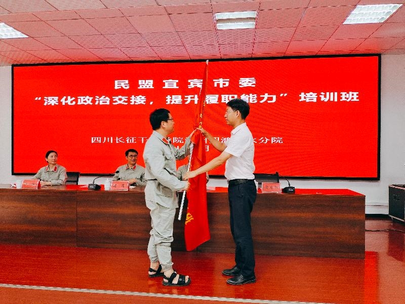 黄启明在开班仪式上为民盟宜宾市委“深化政治交接,提升履职能力”培训班授旗。