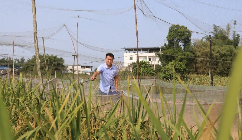 2016年,一直在外打拼的曹洪浩决定返乡支持家乡发展。2018年10月,经过多方考察,曹洪浩在当地流转了30亩土地进行黑斑蛙养殖,先后投入40万余元。通过刻苦钻研、不断摸索,曹洪浩不仅学会了黑斑蛙繁育,还摸索出了一套成熟“稻蛙共生”立体种养模式。田里有稻,水中有蛙,一田双收,一年可收高品质水稻3500斤,亩产成蛙1500斤,年总产值40余万元。