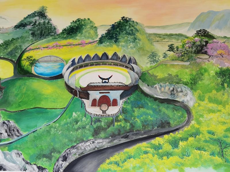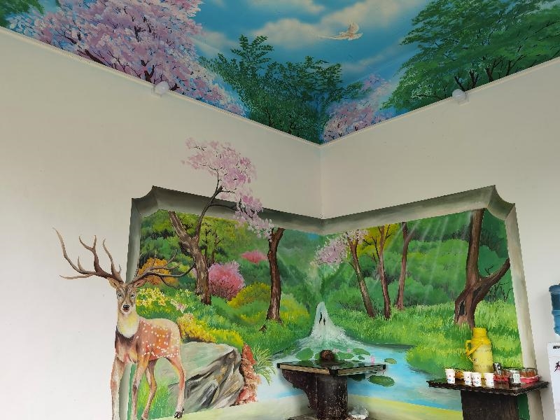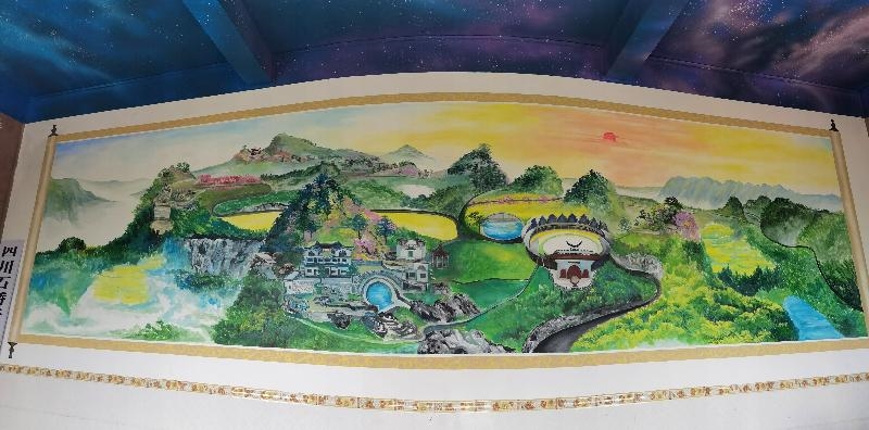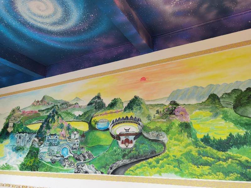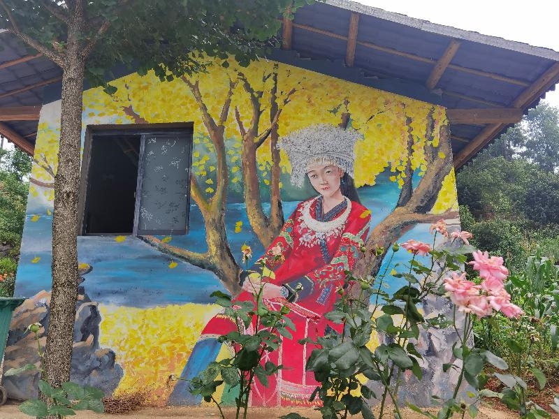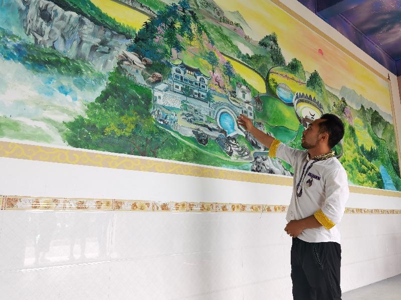 这幅壁画就画在堂屋得墙壁上,整幅壁画清新淡雅,层次分明,在绿水青山、繁花簇锦之间,有序地分布着民族特色浓厚得小农场、民宿、音乐放映大厅、大型吃游广场等建筑,各个部分相得益彰,极为巧妙,一幅乡村振兴得美丽画卷在古超静手中得到了完美呈现。