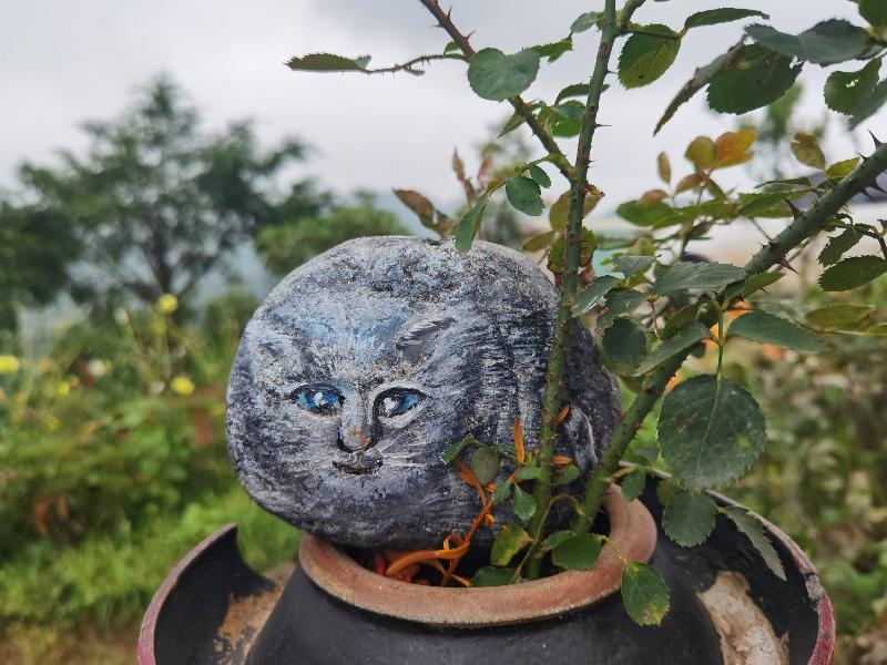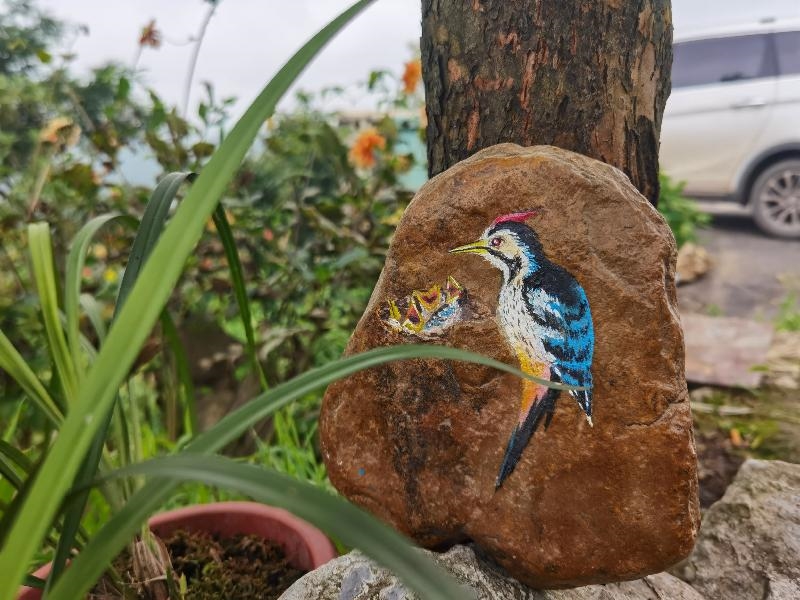 左手托起颜料,右手拿起画笔,时而轻轻描绘,时而大笔勾勒,在小凳上,古超静一坐就是半天时间,在他得笔下,一只栩栩如生得小猫出现在石头上,他用创作艺术让石头“活”了起来。