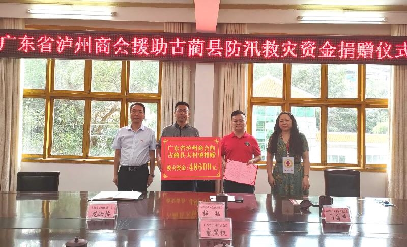 9月6日,广东省泸州商会援助古蔺县防汛救灾资金捐赠仪式在古蔺县工商联会议室举行。广东省泸州商会会长童显权、古蔺县人民政府副县长梅猛出席,县工商联、县红十字会负责人参加捐赠仪式。