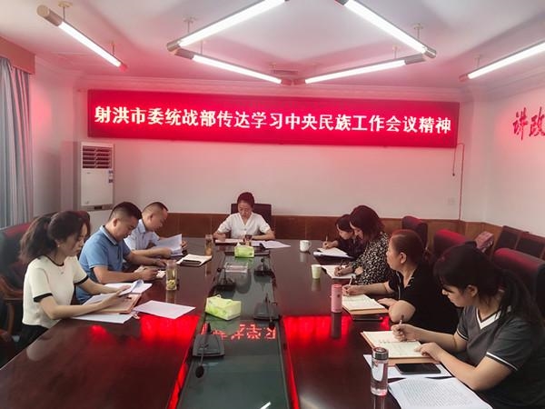 9月6日,射洪市委统战部召开专题学习会,传达学习中央民族工作会议精神,市委统战部、市民宗局全体干部职工参加会议,市委常委、统战部部长刘颖出席会议并讲话。