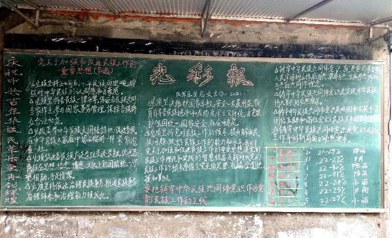 “你们看,今天的黑板报是这两大栏‘中国共产党关于加强和改进民族工作的重要思想’摘录的是‘十二个必须’;‘要把铸牢中华民族共同体意识作为中国共产党的民族工作的主线’,摘录的是‘五个筑牢’。言简意赅,让人一下子就了解到了重点和要义。”83岁的中共党员、退休教师范召军说。