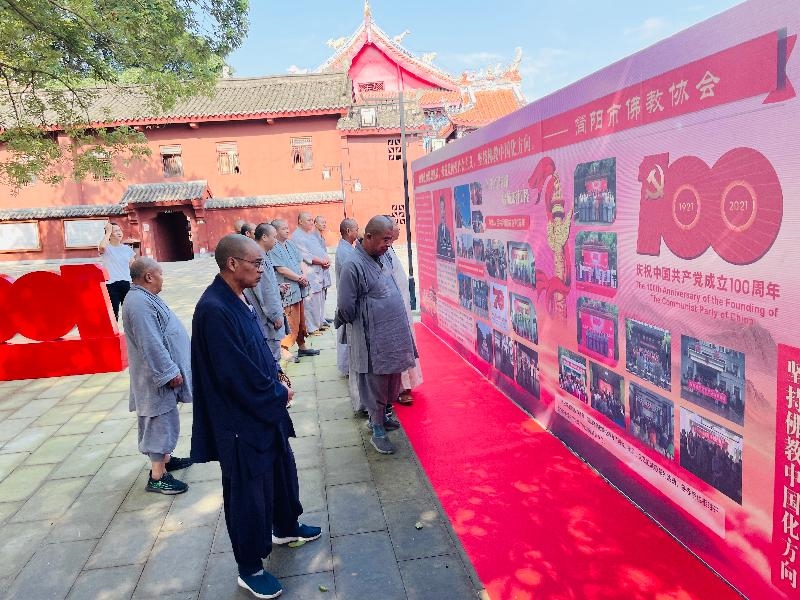 本次摄影图片展上,百余副图片资料,配以详实的文字注释,从爱国爱教、寺院建设、安全生态、文化交流、培养僧才、慈善公益、疫情防控等版块,呈现了简阳市佛教界2016年到2021年五年建设发展的进程与面貌。