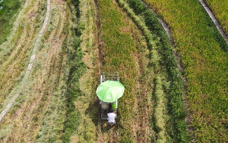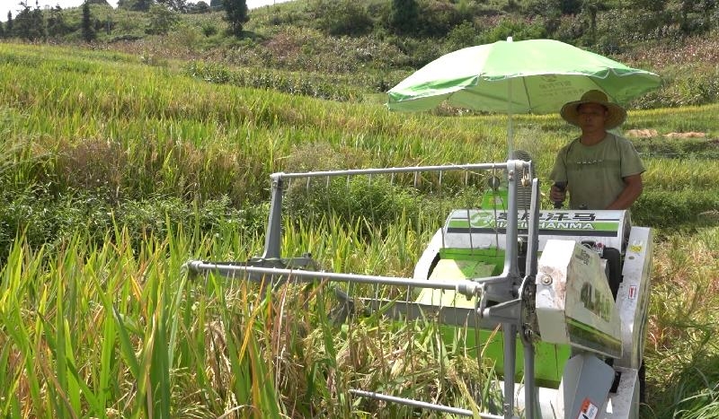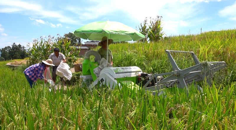收割、脱粒、装袋一气呵成,新购置的收割机不仅省时省力,方便快捷,还操作简单,凤凰村村民姜清强很是满意。这台收割机不仅缓解了高山梯田水稻收割难的问题,也加快了高山水稻的收割进程。