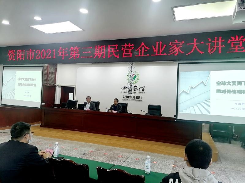 10月28日,资阳市工商联联合资阳市金融工作局、资阳农村商业银行股份有限公司共同举办资阳市2021年第三期民营企业家大讲堂。资阳口腔职业学院院长、教授、硕士研究生导师郑立舸应邀作题为《全球大变局下的中国对外战略和政策》专题辅导报告。