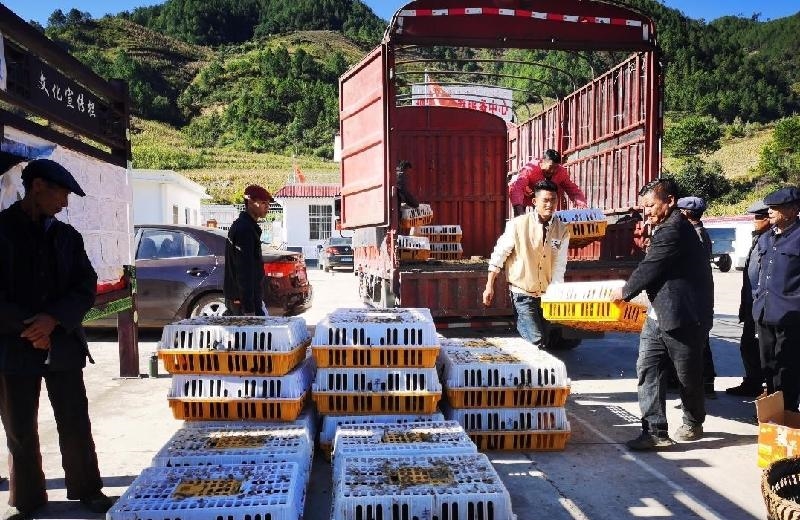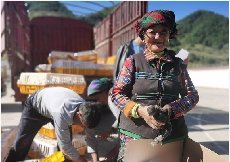 10月26日,在凉山彝族自治州盐源县盐塘镇坝窝村,领到“1元乌鸡”苗的79户彝族群众脸上乐开了花。当天,结对帮扶盐源县的江阳区共向当地彝族群众发放了1020羽“1元乌鸡”苗。