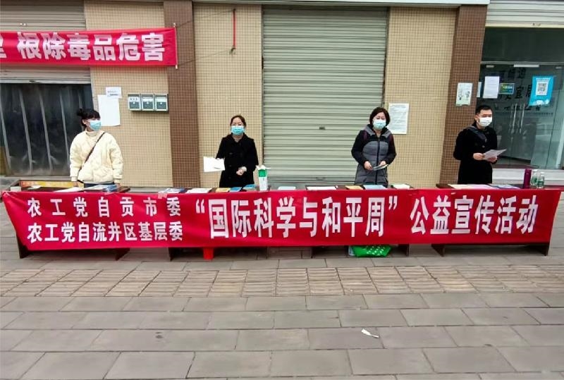 11月12日上午,农工党自贡市委会、自流井区基层委在自流井区舒坪街道联合开展了“国际科学与和平周”公益宣传活动。农工党自贡市委会副主委、自流井区基层委主委刘桥,农工党自贡市委会机关组宣部部长张智敏,自流井区基层委部分农工党党员参加活动。