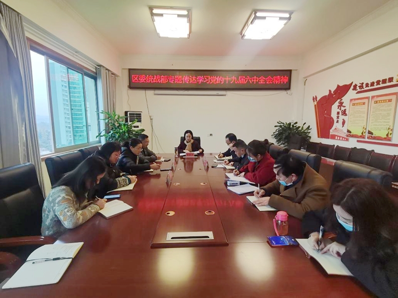 会议强调,要不断增强学习贯彻的政治自觉,把学习宣传贯彻全会精神作为当前和今后一个时期的重要政治任务,迅速在统一战线领域掀起学习宣传热潮,班子成员要带头领学宣讲,当好组织员、宣传员和信息员,从党的百年奋斗中筑牢信仰根基、汲取真理力量,大力弘扬伟大建党精神;要深刻理解“坚持统一战线”这一重要历史经验的丰富内涵,准确把握统战工作职责任务和统一战线工作原则,不折不扣将会议精神落实到统战工作全过程。