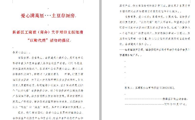 新都区工商联以“爱心满高原,土豆存厨房”号召爱心企业和人士开展“以购代捐”活动的倡议,在倡议的号召下,工商联会员企业踊跃参加,首批爱心认购土豆达55000斤,缓解了部分理塘土豆滞销压力。新都区供销合作社利用全区公共农用品牌“馫都味”实体店+线上销售优势,积极带动新都市民认购。新都区流航物流利用业务优势承接了本次理塘土豆的运送和仓储任务,该企业大额让利的同时,让理塘土豆有了更多的市场竞争力。新都区北新律师事务所不光购买了千余斤土豆,还将部分土豆捐赠给了三合嘉苑封控小区,实现了爱心的传递与延续。