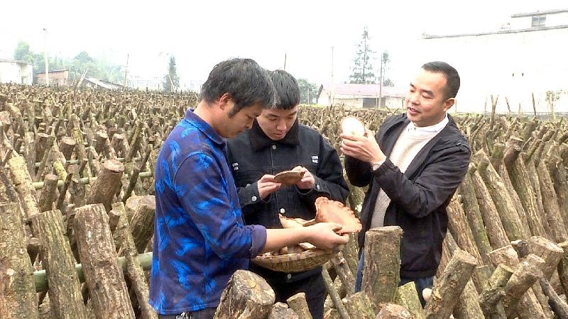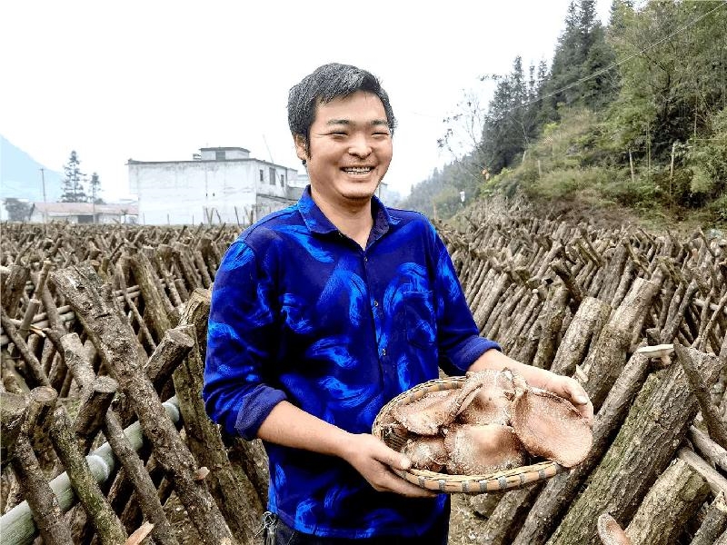 在高坪苗族乡先锋村食用菌种植基地,一排排椴木整齐排放着,一朵朵褐色的香菇饱满诱人。郭术康一边仔细查看香菇的长势,一边采摘成熟的香菇。