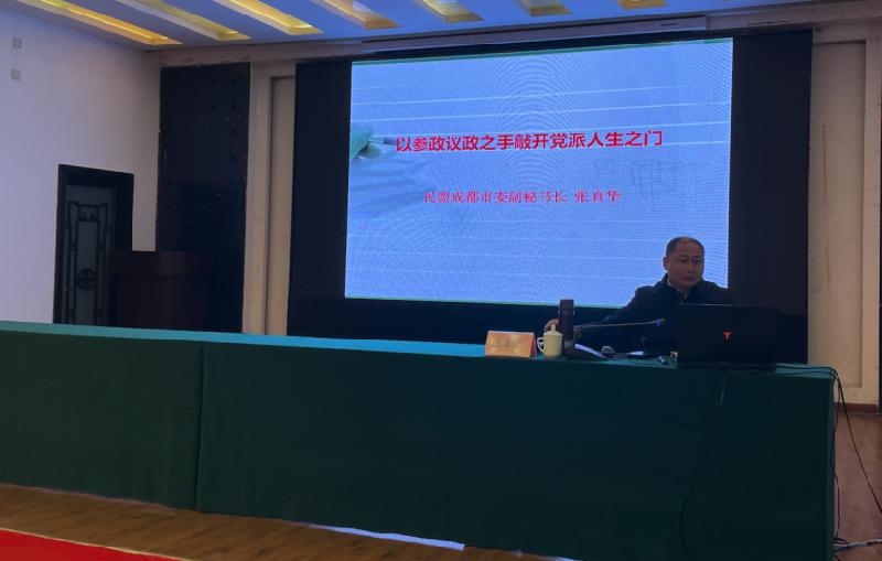民盟成都市委会专职副秘书长张真华应邀对全体学员作了《以参政议政之手敲开党派人生之门》专题讲座,他结合自己多年来参政议政的工作体会,系统讲解了新盟员应该如何立足自身工作,通过盟组织的各类参政议政平台,积极履行好盟员的义务。