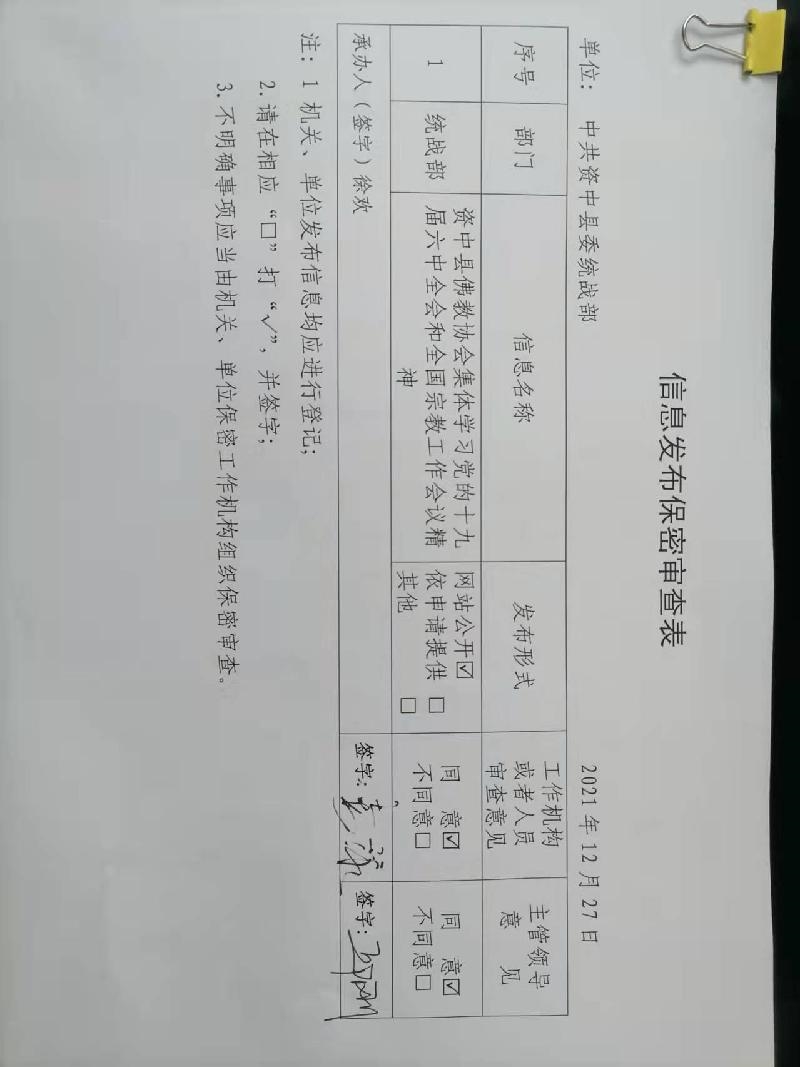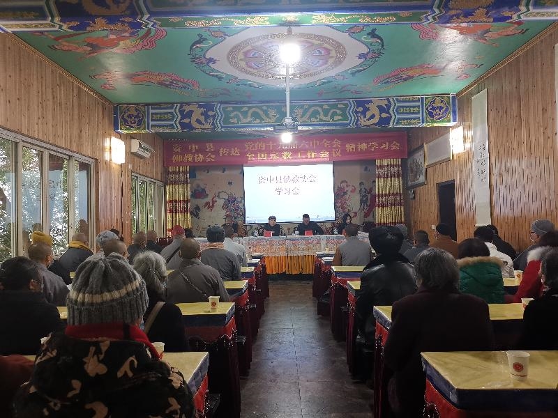 12月23日,资中县佛教协会专题学习会在永庆寺召开。会议邀请内江市委统战部副部长、市民宗局局长康少刚传达学习党的十九届六中全会精神和全国宗教工作会议精神。全县佛教教职人员、各寺庙负责人、常住居士共30余人参加学习。