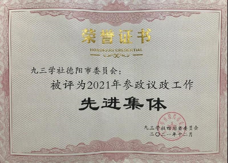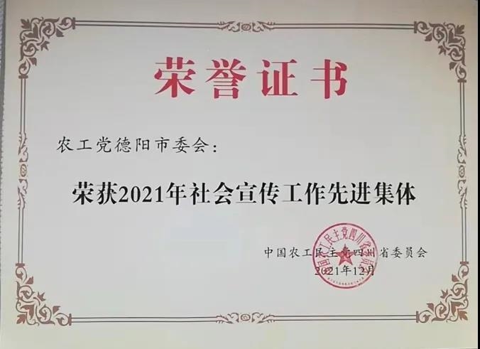 此外,德阳九三学社社员李少斌获得国务院国家科学技术进步奖,德阳农工党党员陈果被农工党中央表彰为先进个人。德阳民革党员刘媛媛、颜志萍、吴丹、蔡昭霞被民革省委表彰为先进个人,德阳民盟盟员米明芳、程硕、李玉兰、钟立华被民盟省委表彰为先进个人,德阳致公党党员朱国红、佘国强被致公党省委表彰为先进个人。