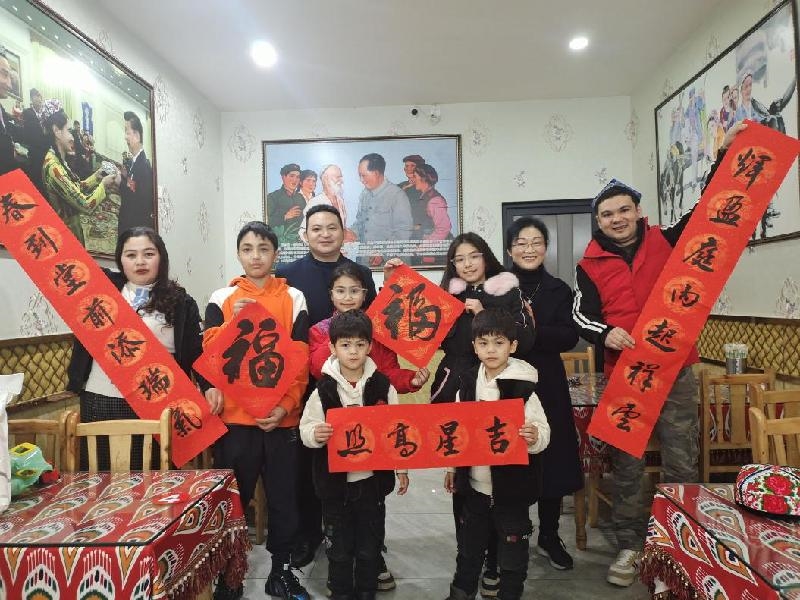 伍文隆来到已在夹江经商生活15年,来自新疆的买买提一家走访慰问,了解到买买提一家7口在夹江购置了新房、购买了轿车,5名子女均在夹江学习生活的实际情况后,对他一家靠自己辛勤的劳动取得的成果表示祝贺,对春节期间的防疫工作和食品安全提出了要求,预祝他们一家人春节快乐。临行前,买买提拿出漹城街道新华社区赠送的春联和福字,邀请慰问组合影留念。