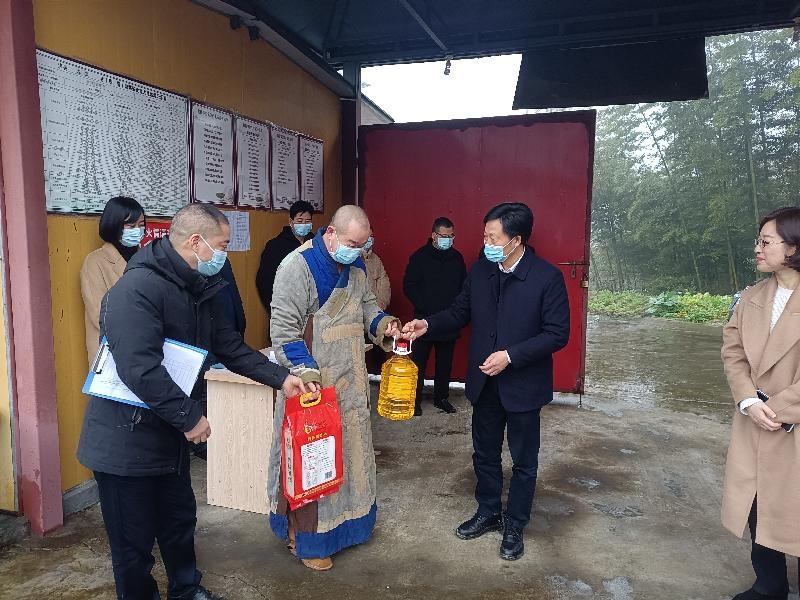 在天兴镇龙贯寺,朱大清详细了解了宗教场所的历史,教职人员生活状况、信教群众情况,为教职人员送上慰问品,要求教职人员注意场所用火用电安全,严禁在林区燃放烟花爆竹,引导信教群众做好安全生产、疫情防控等工作。