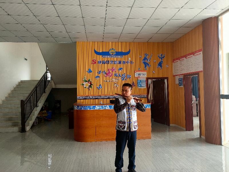 会上,专委会会员王飞即兴表演了彝族长笛和木叶吹奏技艺,悦耳动听的悠悠笛音和缠绵悠长的木叶之声伴随绿茶的清香在苗乡上空飘荡开来,层层向外扩散。(杨齐国)