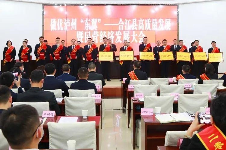 会议表扬了2021年合江县高质量发展贡献奖先进个人代表、招商引资先进个人代表、项目攻坚先进个人代表、优秀民营企业、纳税大户代表、建筑产业发展服务先进单位代表、金融监管先进单位。
