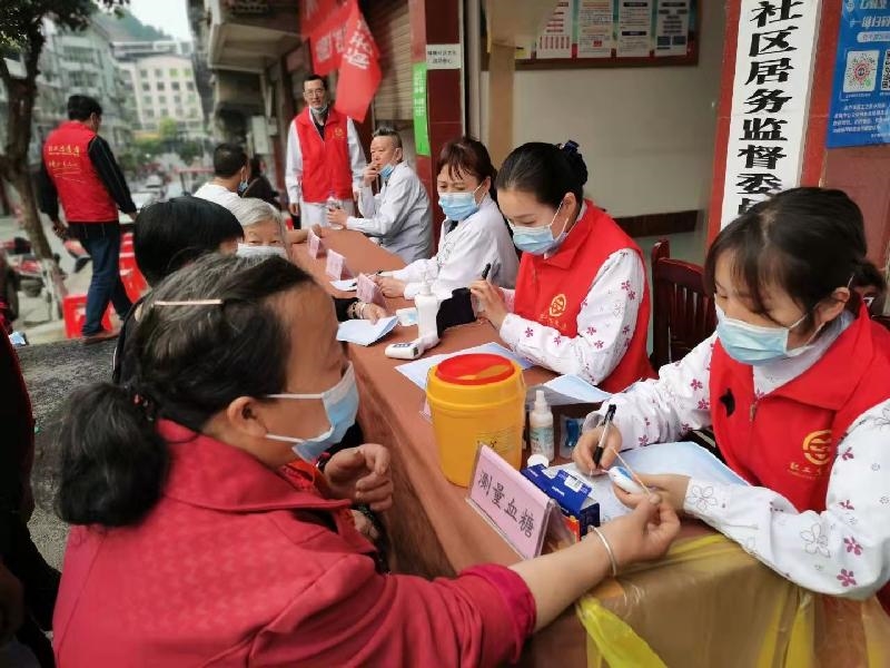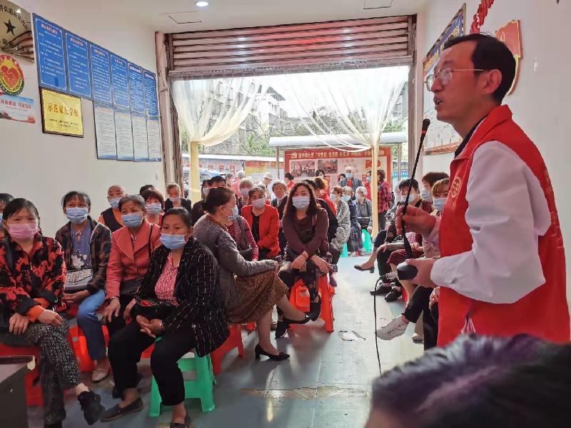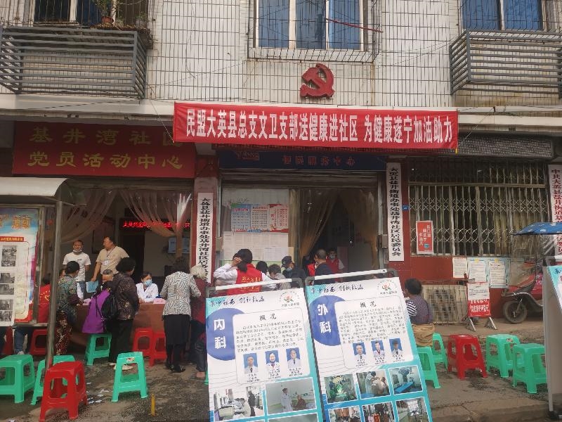 3月16日,民盟大英县总支文卫支部组织民盟盟员、大英兴奎医院院长、全科医生陈东升带领大英兴奎医院医护工作者、志愿者共15人来到大英县盐井街道基井湾社区开展“送健康进社区·为健康遂宁加油助力”主题活动。