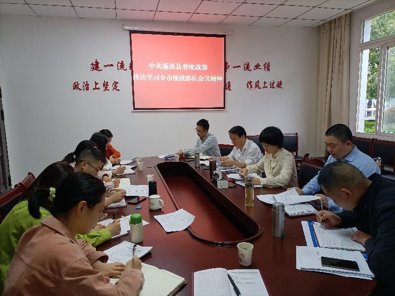 会议要求,深入学习贯彻落实全市统战部长会议精神是当前一项重要政治任务。一要在学习传达上有热度。要通过县委常委会、统战工作领导小组会、统一战线学习会等会议,利用蓬溪统战微信公众号、简报、微信群和QQ群等平台,及时传达学习会议有关精神,做到每个统战成员、每名统战干部全覆盖、全领会、全落实。二要在工作推进上有力度。要谋划好今年统战工作,以大力实施“三遂”工程建设年行动为抓手,大力实施政治引领“聚心”、服务大局“聚力”、精业笃行“聚标”、实践创新“聚亮”、固本强基“聚能”行动,抓实“喜迎二十大·奋进新征程”同心系列主题教育活动、盟遂合作示范区建设、民营经济、民族宗教、同心助力乡村振兴、党外干部队伍建设、信息宣传调研等重点工作,推进各领域统战工作大落实大提升。三要在叫响品牌上有亮度。坚持整体工作上水平、难点工作有突破、重点工作有创新、单项工作有特色,打造基地建设样本、推出制度规范样标、形成实践创新样品、干出统战干部样子,推动统战工作“蓬溪样板”建设,擦亮盟遂合作、新乡贤、门都茶事、同心联盟、积分评星等统战工作品牌,讲好蓬溪统战故事,叫响蓬溪统战声音。