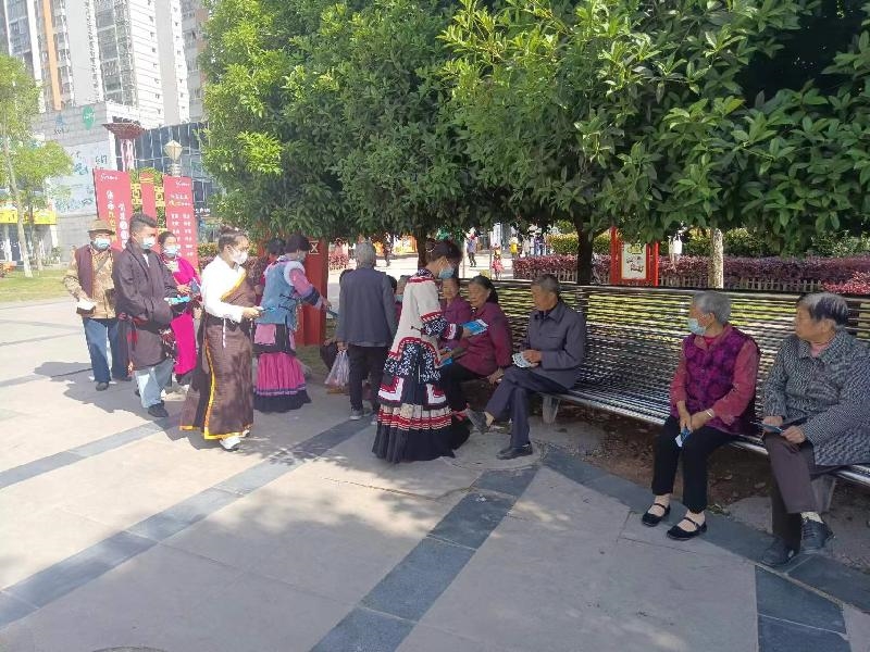 杨震一行向社区各族群众、居民楼栋、商超店铺发放《四川省城市少数民族流动人口服务指南》、创文宣传资料1000余份,开展文明城市创建和维护促进民族团结进步宣传,带领各族群众组成的志愿者队伍深入社区楼栋小巷开展文明劝导、垃圾清扫,走上街头开展交通文明劝导、宣传低碳出行、搀扶老人过斑马线,进入在建工地、农贸市场等开展创文工作宣讲和环境卫生死角整治工作。