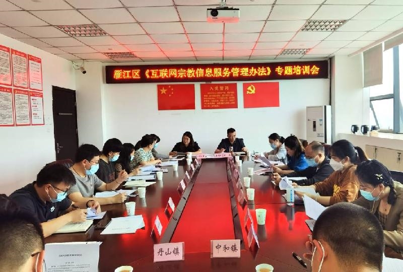 为进一步推进《互联网宗教信息服务管理办法》(以下简称《办法》)贯彻实施,4月22日,雁江区民宗局组织召开《办法》专题培训会。区委统战部副部长、区民宗局局长曾勇主持会议并讲话。各镇(街道)民宗干部18人参加会议。