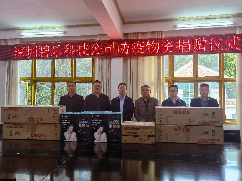 4月19-22日深圳碧乐科技有限公司向泸州市古蔺县捐赠:口罩33.3万只,消杀仪4台,空气净化器23台,净水器(或太阳能灯)285台。用实际行动倡导和弘扬了“一方有难,八方支援”的良好社会风尚,体现了碧乐科技强烈的责任担当,彰显了中华民族守望相助的情怀力量。