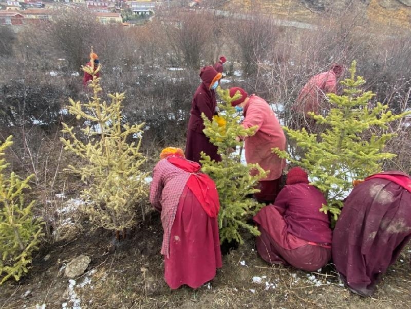 红原县尼姑寺抓住高原植树黄金时段,组织全寺尼姑顶风冒雪,在寺庙周边滑坡、植被稀疏地带开展义务植树活动。虽遇寒冷时节,风雪交加,但丝毫没有影响尼姑们的热情。尼姑们有的挖坑、有的扶树、有的培土、有的浇水,干得热火朝天,不亦乐乎。