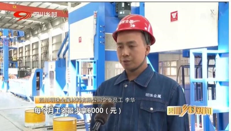 四川明珠金属材料有限公司企业员工 李华:我是一名拉丝工,每个月工资最少拿6000元,最多拿7000元,可以照顾家庭。
