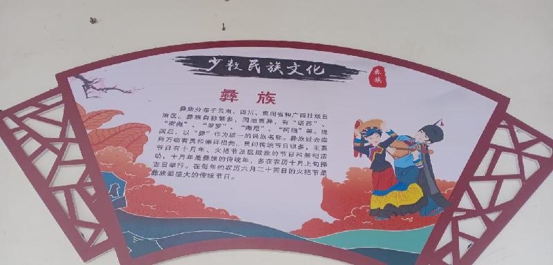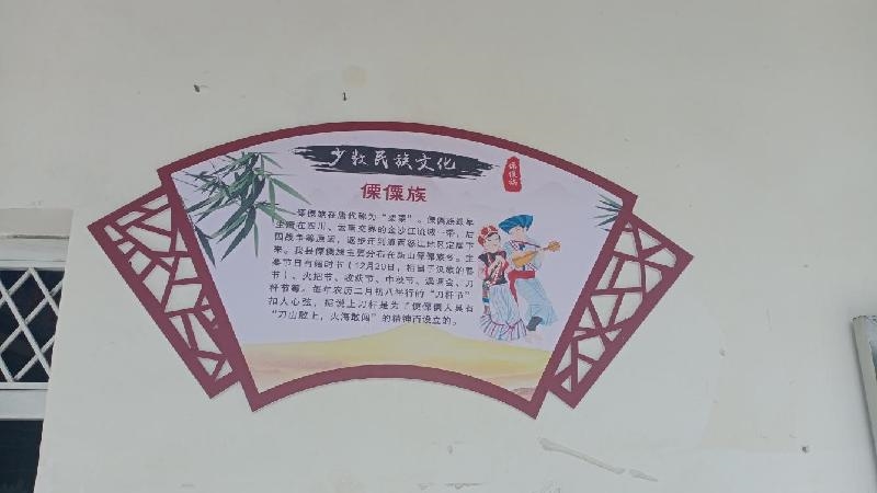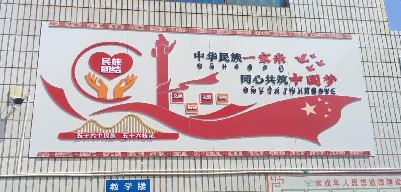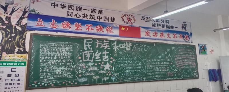 走进教学楼,各班教室门前都贴着介绍一个民族文化的扇形图画,介绍少数民族人口、居住地、各种节日。只要走完一次教学楼,你就能了解中华民族这个大家庭中各成员的文化民风民俗。