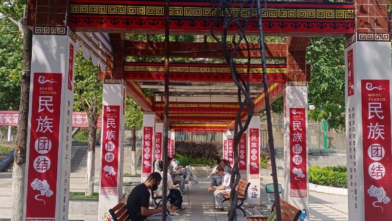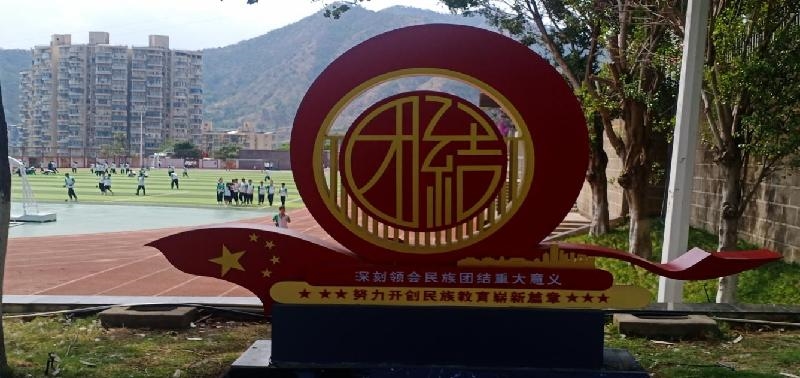 在校园草坪上矗立着“民族团结”徽章,校园板报上,用彝汉双语书写“两个共同”“三个离不开”,用文化塑造有灵魂的教育,校园内处处彰显着民族团结进步的宣传氛围。