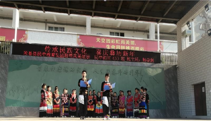米易县民族中学校是一所以少数民族学生为主体的初级中学校,学校现有教职工 131人,学生1215 人,包括彝族、汉族、傈僳族、回族等7 个民族,其中少数民族学生688人,占全校学生的 57 %。学校把民族团结进步教育贯穿于学校教育工作的各个环节,形成了具有民族特色的育人环境,在传承弘扬各民族优秀传统文化的同时,有效推动了民族团结进步示范学校创建工作。