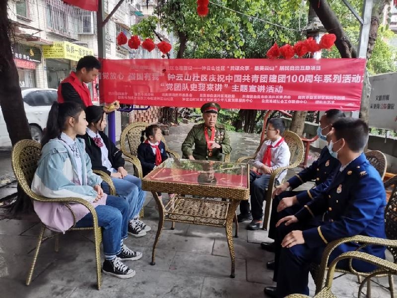为庆祝中国共青团成立100周年,喜迎二十大召开,自流井区东兴寺街道钟云山社区社会组织星火筑梦青少年儿童发展服务中心以“请党放心 强国有我”开展庆祝中国共青团建团100周年系列活动,融入新阶力量引导社区青少年儿童在融入社区、服务社区中践行社会主义核心价值观,厚植爱党、爱国、爱社会主义的情怀。