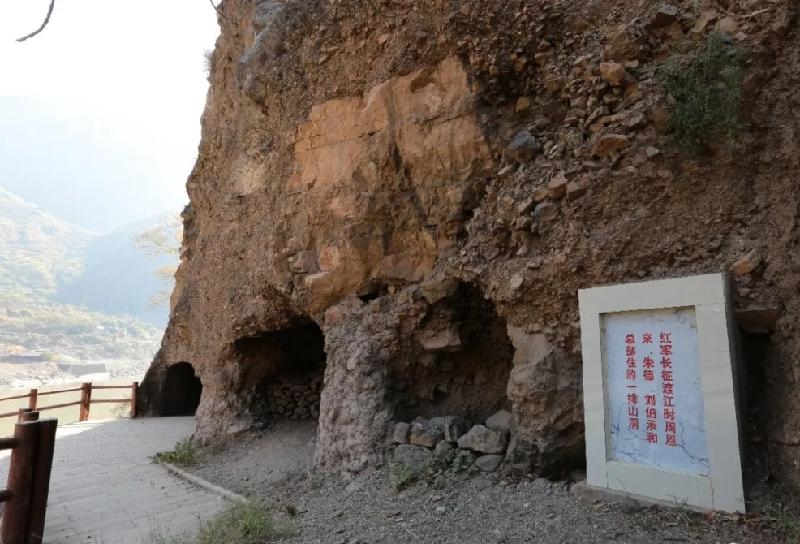 从观景台沿着蜿蜒的山路下到山脚,由于乌东德水电站的建成蓄水,昔日湍急的江流已变得宁静平缓。春末夏初,站在岸边,只见江水粼粼,碧波潋滟,高峡出平湖,雄山映大川,满目一派宏伟壮观的雄奇景象。沿着江边公路行走约一公里,即是皎平渡山洞遗址复原地。皎平渡山洞原是马帮赶脚人歇息的地方,巧渡金沙江时毛泽东等红军领导人曾在洞内居住。现原址已因乌东德水电站蓄水被淹没,为最大程度保护红色遗迹,传承红色基因,赓续红色血脉,除了对水下遗址进行封护加固外,还在原址的上方采用3D激光扫描建立三维模型,按照1:1复建了遗址山洞。躬身走进复建的山洞,忆古思今,简朴的设施和伟大的胜利不禁让人轻声吟诵起“金沙水拍云崖暖”的豪迈诗句。