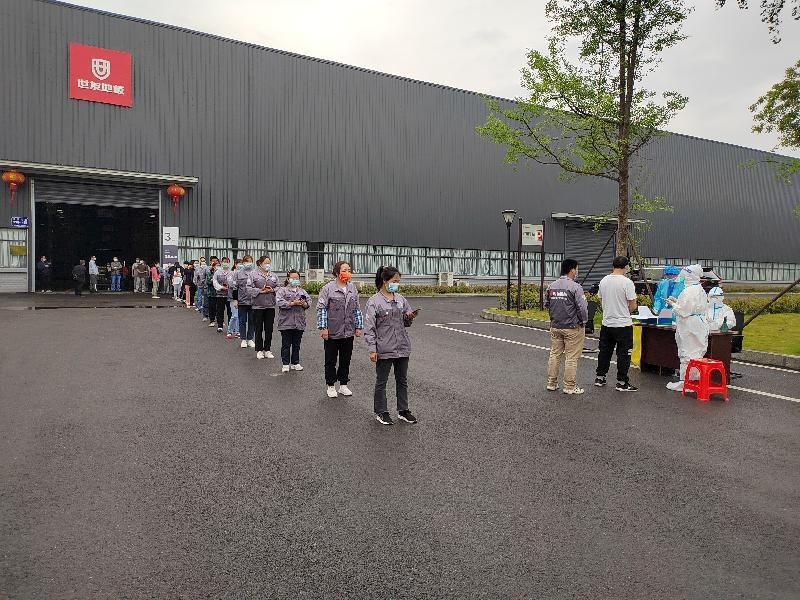 5月24日,区工商联联合官盛新区组织医护人员到世友木业上门开展核酸检测服务。