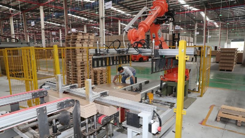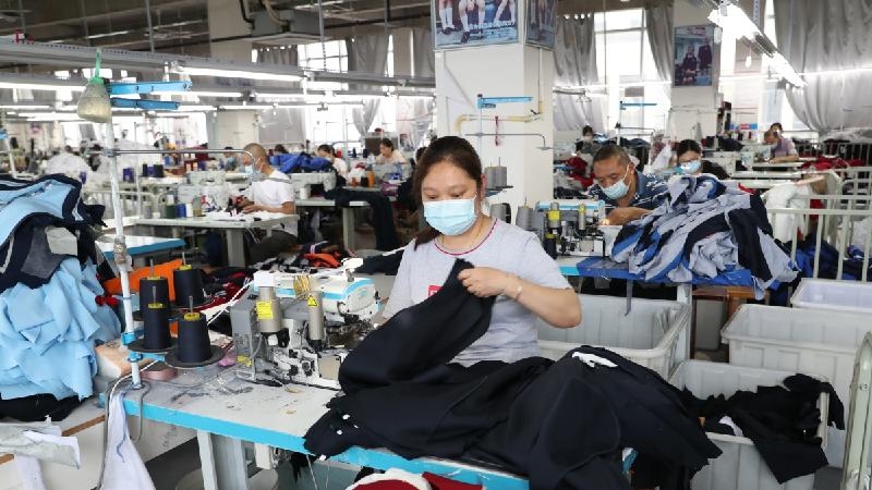5月25日,广安区官盛新区世友木业的工人正在有序进行地板生产加工,弘博士实业公司服装加工厂工人们正在加紧生产订单校服。