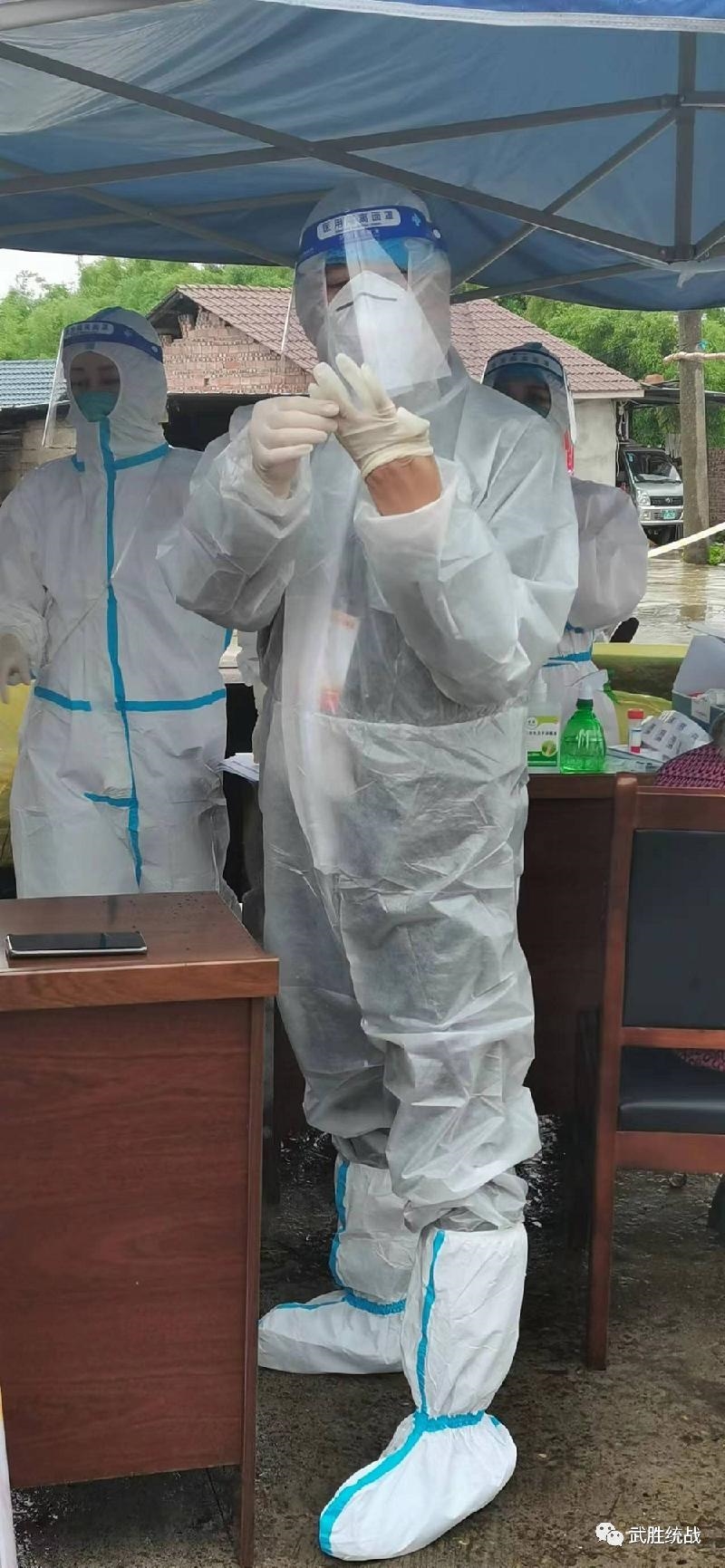 九三学社武胜支社社员陈亚冰连续5天赴邻水县八耳镇虎跳水村参与入户核酸采集工作。