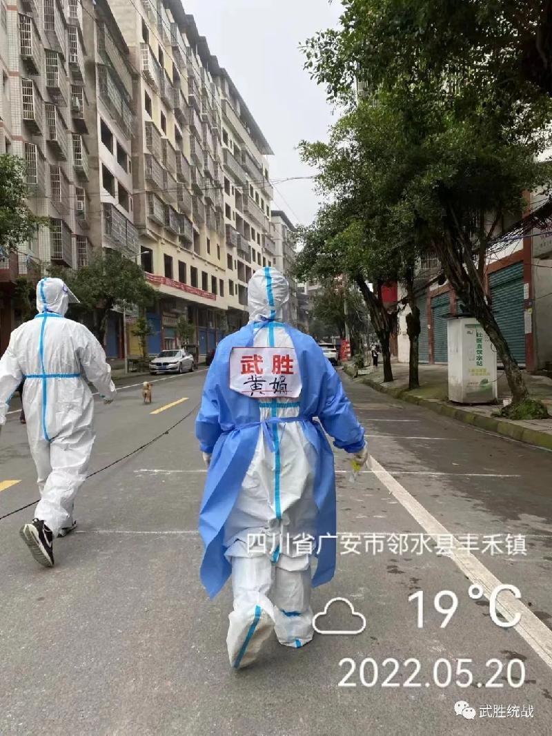 九三学社武胜支社社员黄娟,从5月12日接到命令后就一直战斗在邻水一线,从事中高风险社区居民核酸采样工作,累计数千人次。