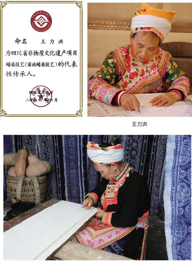王力洪年幼时,家里姊妹甚多,家庭负担过重,只读了两年小学便辍学务农,在农闲时拜姑祖母为师学习蜡染技艺。在半个世纪的蜡染人生中,她为珙县、云南威信等地苗族同胞蜡绘衣裙布料1000多米,将具有珙县地方特色的苗族蜡染工艺传承发扬。