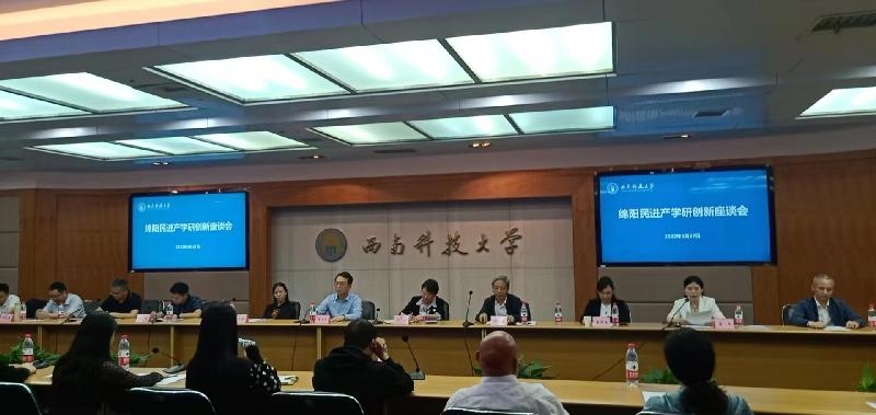 5月27日,民进绵阳市委产学研创新主题座谈会在我校召开。绵阳市人大常委会副主任、民进市委主委李京平,西南科技大学党委常委、统战部长王姮,绵阳职业技术学院党委常委、宣传统战部部长陈波,绵阳市科协党组书记、常务副主席王久华,绵阳市科技局副县级领导陈刚,游仙区政协副主席、民进市委副主委秦顺英,民进市委秘书长赵波出席会议,市直基层组织代表和联合举办支部的会员参加活动。座谈会由民进西南科技大学支部主委张庆明主持。