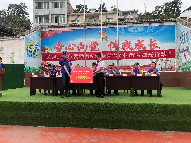 5月25日,民盟泸州市委到对口帮扶的新华小学开展“农村教育烛光行动”,组织盟员企业家、教师20余人为学生们捐赠书包、字帖、绘画用品等学习用具,为全校师生送去美术、音乐、书法、舞蹈、礼仪等艺术课。民盟泸州市委主委、市政协副主席杜旭林深情寄语全校学生:“希望大家好好学习,实现梦想,努力成为乡村振兴的栋梁之才!”