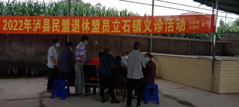 民盟泸县基层委员会盟员、立石镇政府干部石玉梅会同骆明珍、贺光贤等退休老盟员到天堂村为现场40余名贫困孤寡老人提供义诊服务,盟员们利用丰富的基层工作经验,为现场群众讲解城乡居民医疗保险、农村养老保险等政策,普及身体健康养生技巧、夏季常见病预防等保健知识。