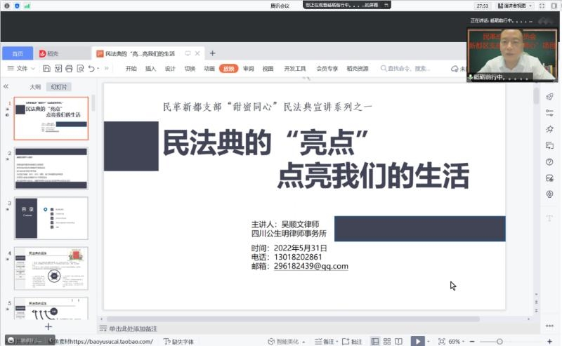 2022年5月31日,民革新都区支部组织了“甜蜜同心”民法典线上系列讲座,支部党员、四川公生明律师事务所吴顺文律师做了题为《民法典的“亮点”点亮我们的生活》的讲座报告。支部党员、积极分子、理塘县对口企业管理人员共40余人参加了此次讲座。