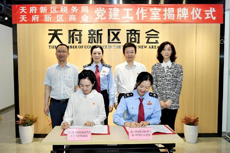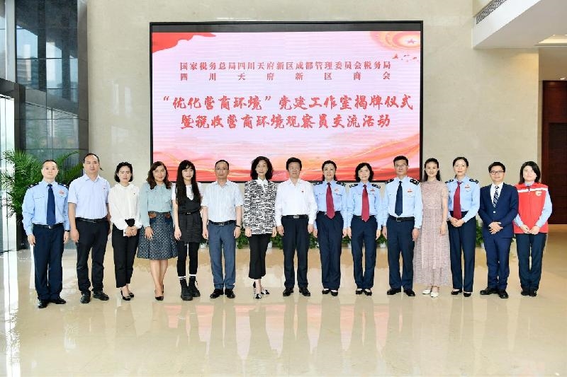 为认真学习贯彻省第十二次党代会精神,助力优化营商环境,推动天府新区民营经济高质量发展。近日,四川天府新区党工委党群工作部联合四川天府新区税务局及四川天府新区商会组织开展联学活动,举行“党旗领航 菁税先锋 优化营商环境”党建工作室挂牌仪式,以务实举措推动省第十二次党代会精神快速落地见效。四川天府新区党工委党群工作部、四川天府新区税务局及四川天府新区商会相关负责同志出席活动。
