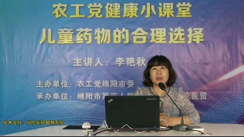 本次活动由农工党绵阳市委主办,市三医院支部、中西药支部和绵阳科伦医贸公司联合承办。通过科伦医贸智慧系统的线上平台,农工党绵阳市委委员、社会服务部主任、市三医院支部主委,市三医院儿科主任李艳秋主任医师深入浅出地为大家讲解了儿童生病时如何科学地选择药物及有关注意事项。