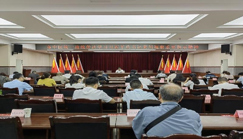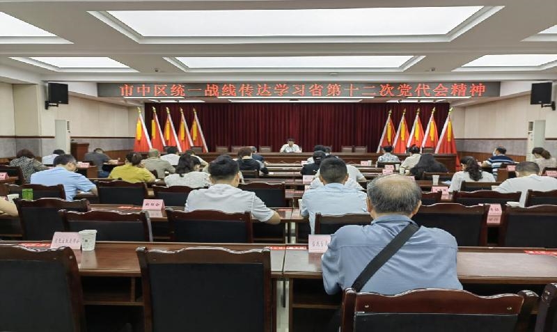 6月14日,市中区统一战线组织召开专题会议,传达学习习近平总书记来川视察重要指示精神暨省第十二次党代会精神。各民主党派基层组织主委、副主委,区工商联主席、党组书记、秘书长,无党派人士代表,区新联会会长、秘书长,区级宗教团体负责人,少数民族代表人士,港澳台侨人士代表参加会议。区委常委、统战部部长柳永胜主持会议并讲话。