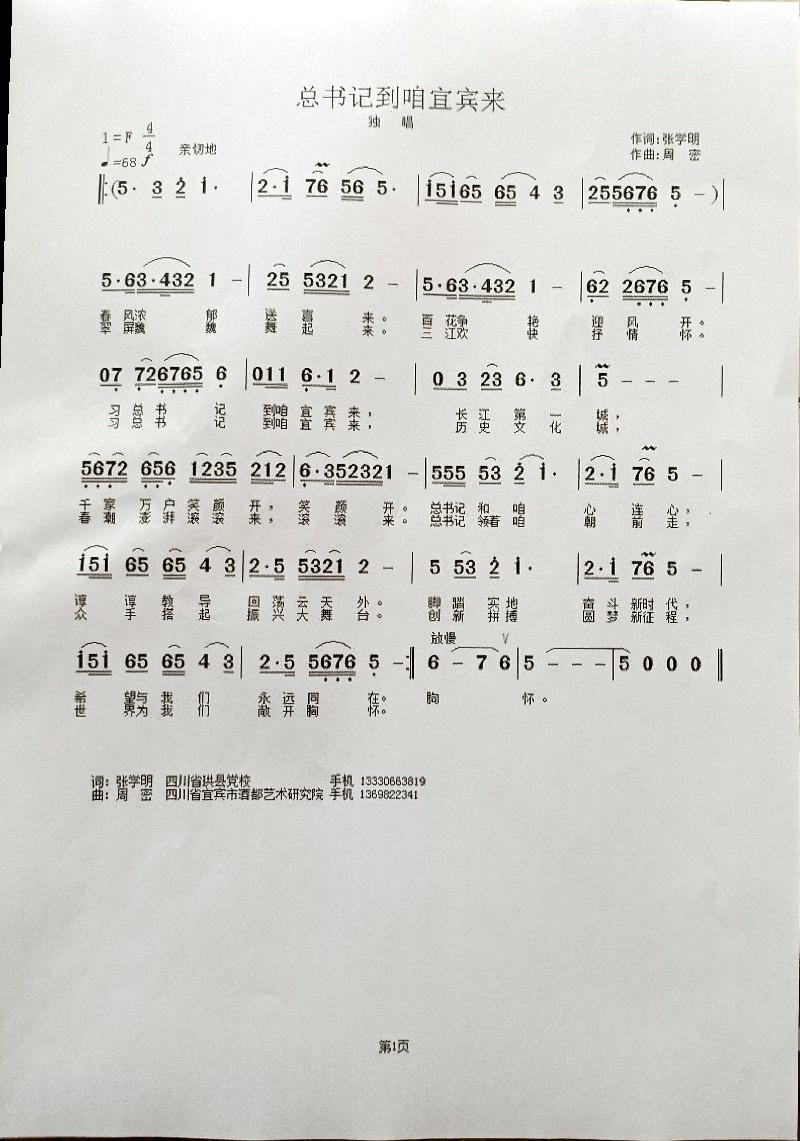 6月8日下午,习近平总书记来四川宜宾视察,全市人民倍受鼓舞、倍感振奋、倍增信心。珙县迅速在全县各界掀起学习贯彻习近平总书记来宜视察重要指示精神热潮。文艺界以独有的方式表达自己的心声,一首由珙县本土音乐创作家张学明老师作词,宜宾酒都艺术研究院周密老师作曲的《总书记到咱宜宾来》破土而出。歌词质朴简洁,曲风悠扬婉转,饱含热情,表达了宜宾500万同胞对总书记的爱戴和感激,表达了对党的感恩之情,唱响了对美好生活的无限憧憬。