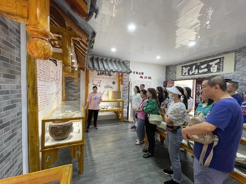 研学组一行首先参观了金沙江大峡谷观景台,党内苴却砚专家张学孟为大家详细介绍了大峡谷地貌,并就苴却砚的形成及价值进行了知识普及。随后参观了家家有院,院院相邻;门前有巷,巷巷相通的迤沙拉村特色建筑,穿过农事体验广场来到迤沙拉村史馆展厅,在展厅讲解员的带领下对迤沙拉彝族民族服饰、农耕器具、乐器、族谱等有了新的了解,对迤沙拉村的人物风采、马帮文化、宗教文化、民俗文化等有了新的认识。