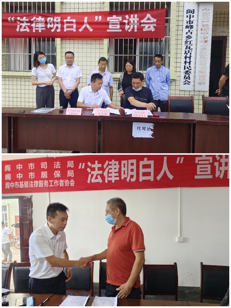 同时为更好推进“法律进村社”,为社会弱势群体提供优质的法律援助服务,阆中盟员、阆中市基层法律工作者协会会长冯文彬代表协会与峰占乡两个贫困村红瓦店村、大垭口村签订乡村振兴法律帮扶战略协议。遵照协议阆中市基层法律工作者协会将定期对村民进行法制宣传、法律讲座,并现场提供法律咨询,将对脱贫户、低保户、特困等家庭提供义务法律援助服务。
