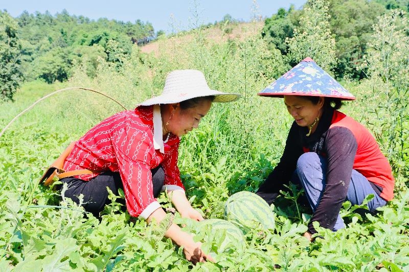 7月,阳光火辣,湛蓝的天空底下是一片绿色瓜藤,一个个圆圆的西瓜便隐藏在其间。工作人员戴上帽子,娴熟地在藤蔓中寻觅成熟且品相极好的瓜。看纹路,轻轻拍打瓜身,“砰砰砰”的声音,并伴随着一些震动,一个好瓜立即被摘下放进背篓。